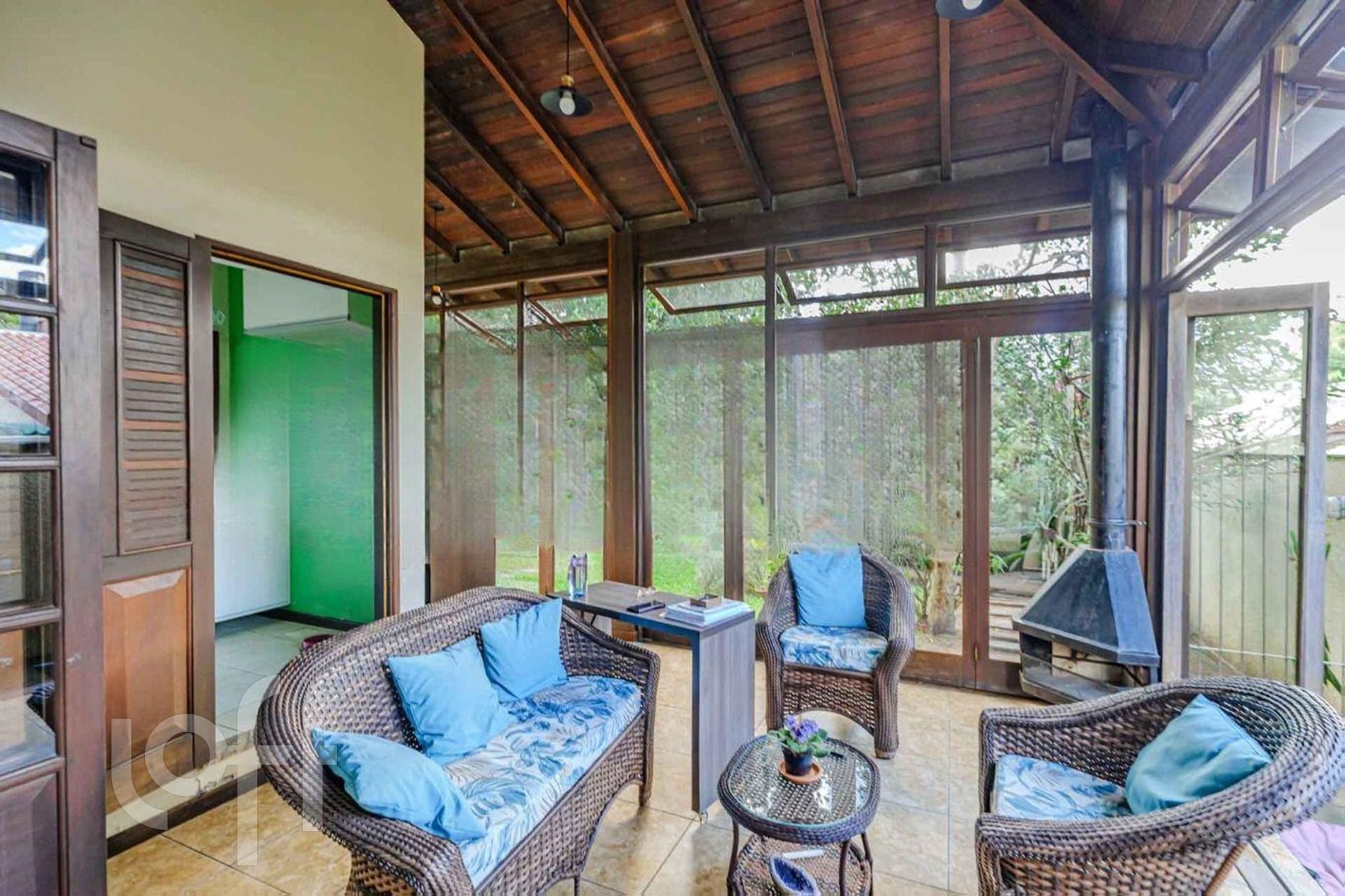 Varanda com lareira voltada para o pátio