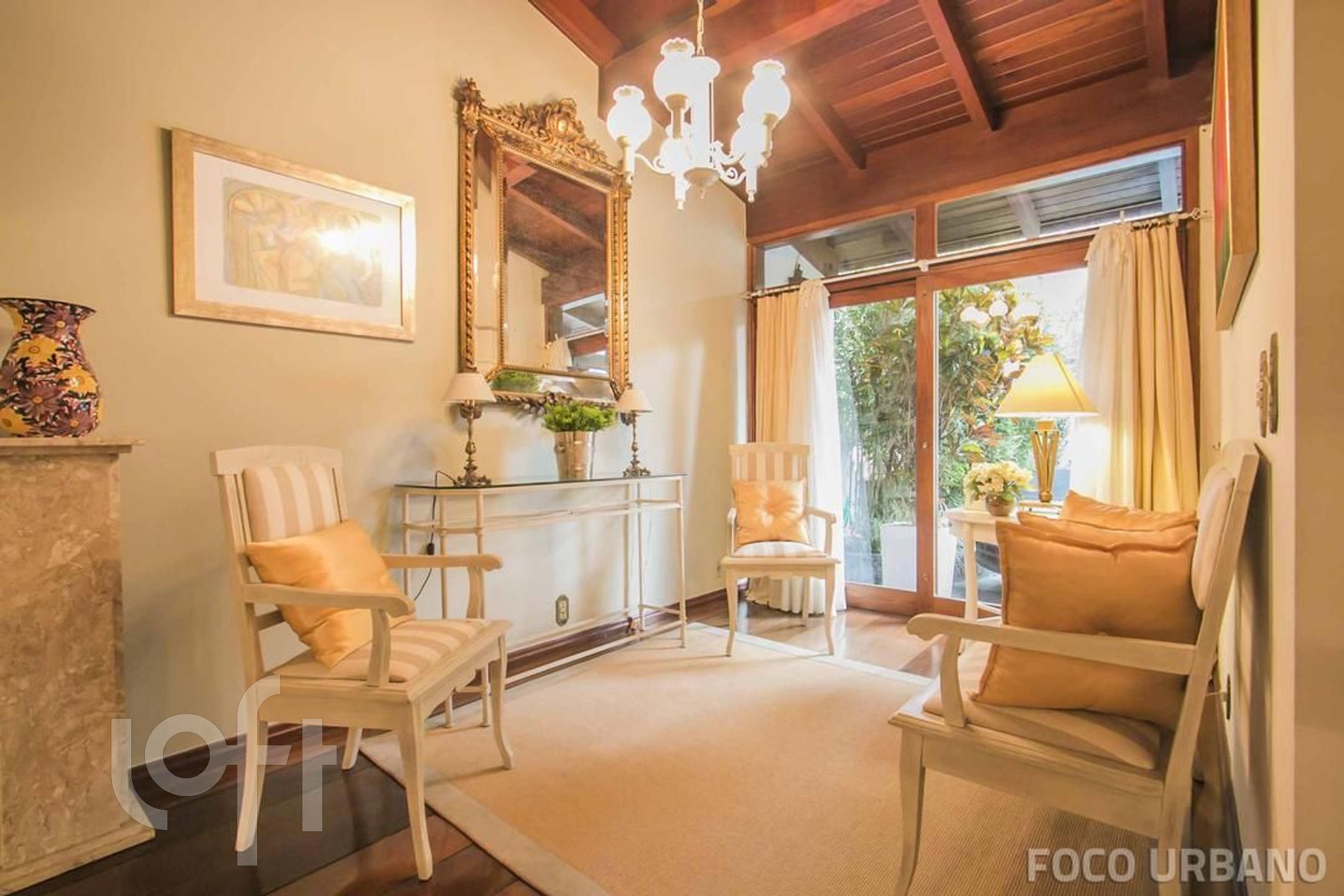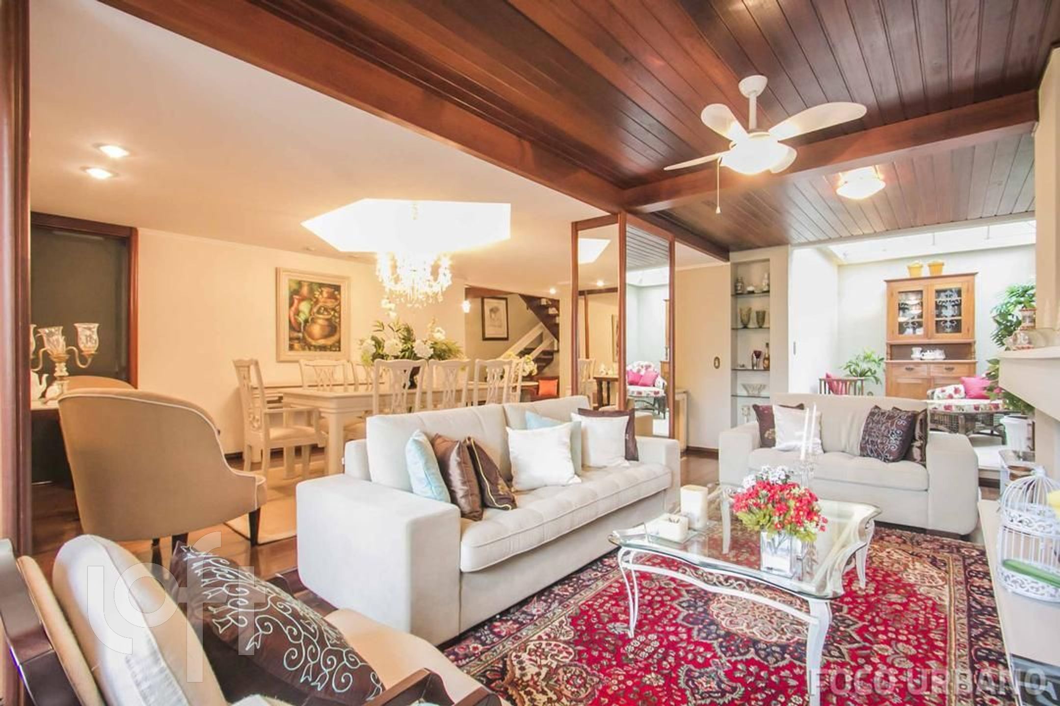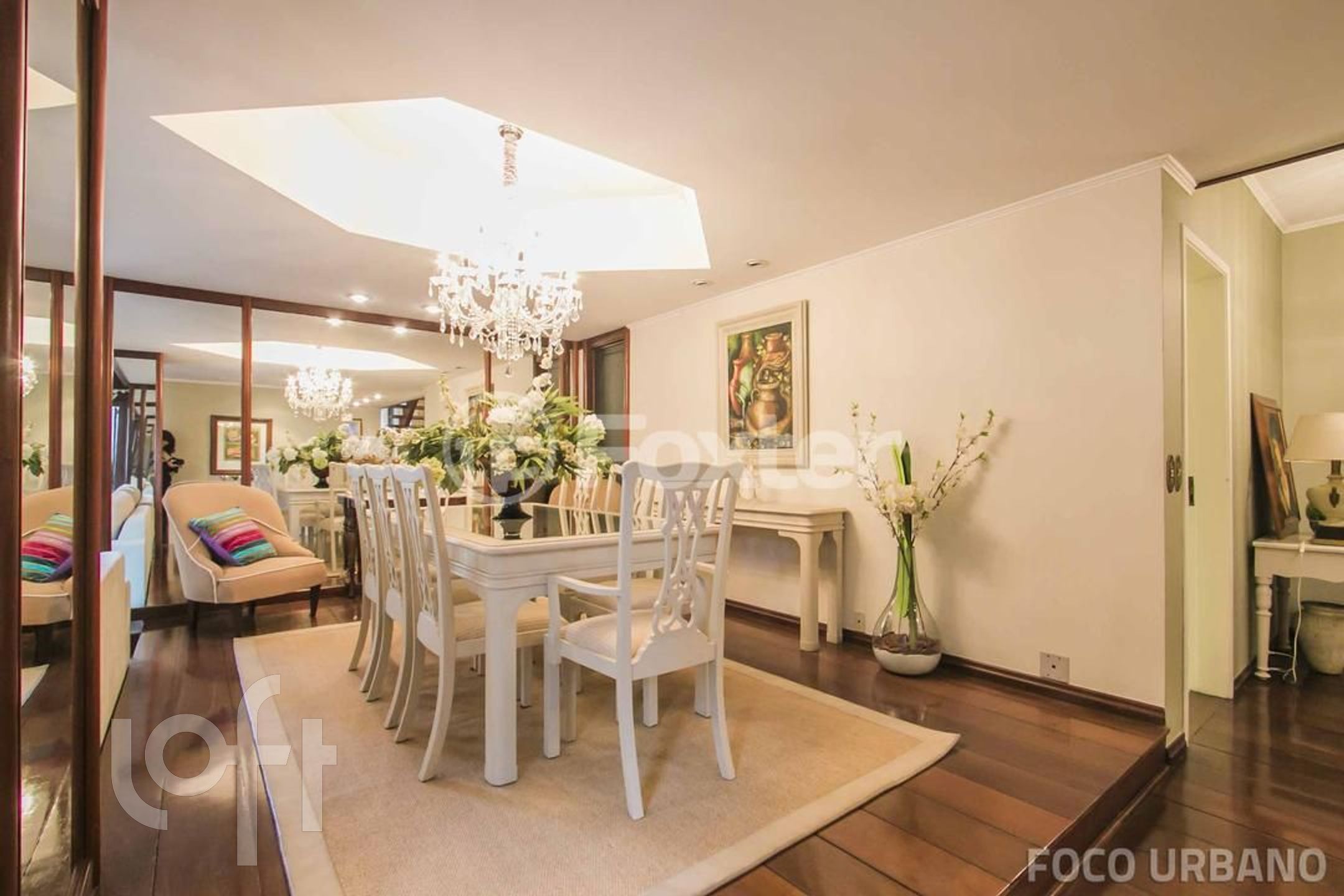 Piso térreo: Hall imponente com pé direito duplo e ante sala, lavabo, living 3 ambientes em taboão integrados, com um pequeno recanto, amplo estar com lareira e vista para o jardim, e em desnível sala de jantar. Acoplado ao estar, um agradável jardim de inverno com iluminação natural. Copa cozinha e garagem para 4 carros.