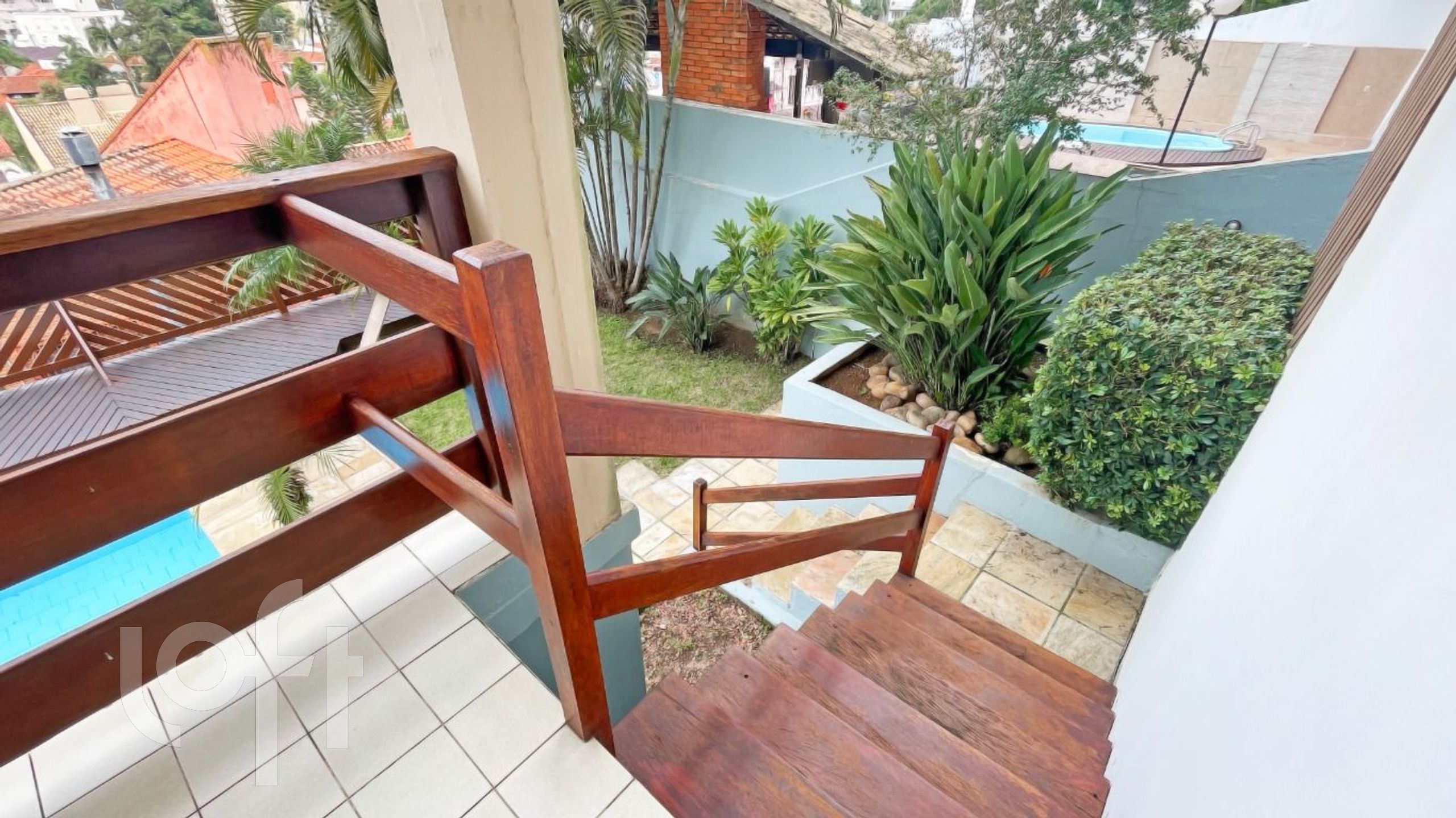 garagem para 3 carros, espaço de churrasqueira com lavabo e sacada acesso ao nível da piscina, dependência completa e área de serviço com despensa, também com acesso à piscina.