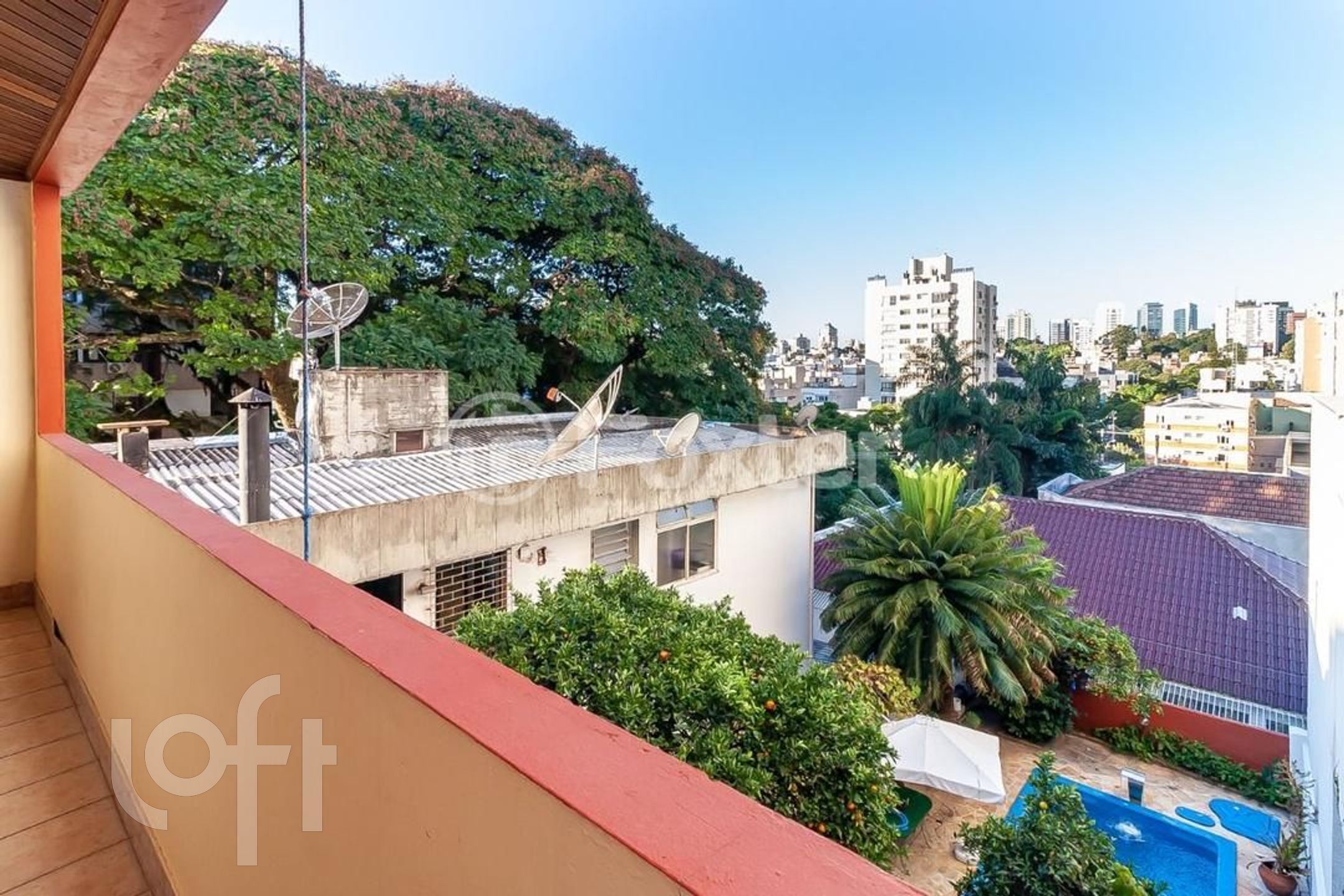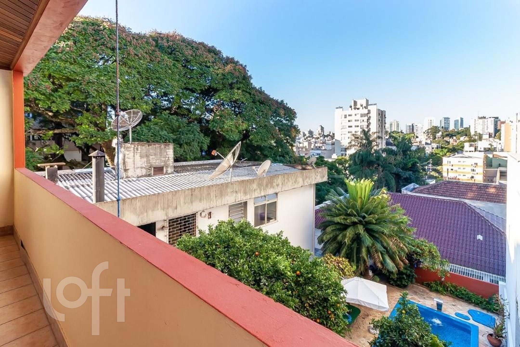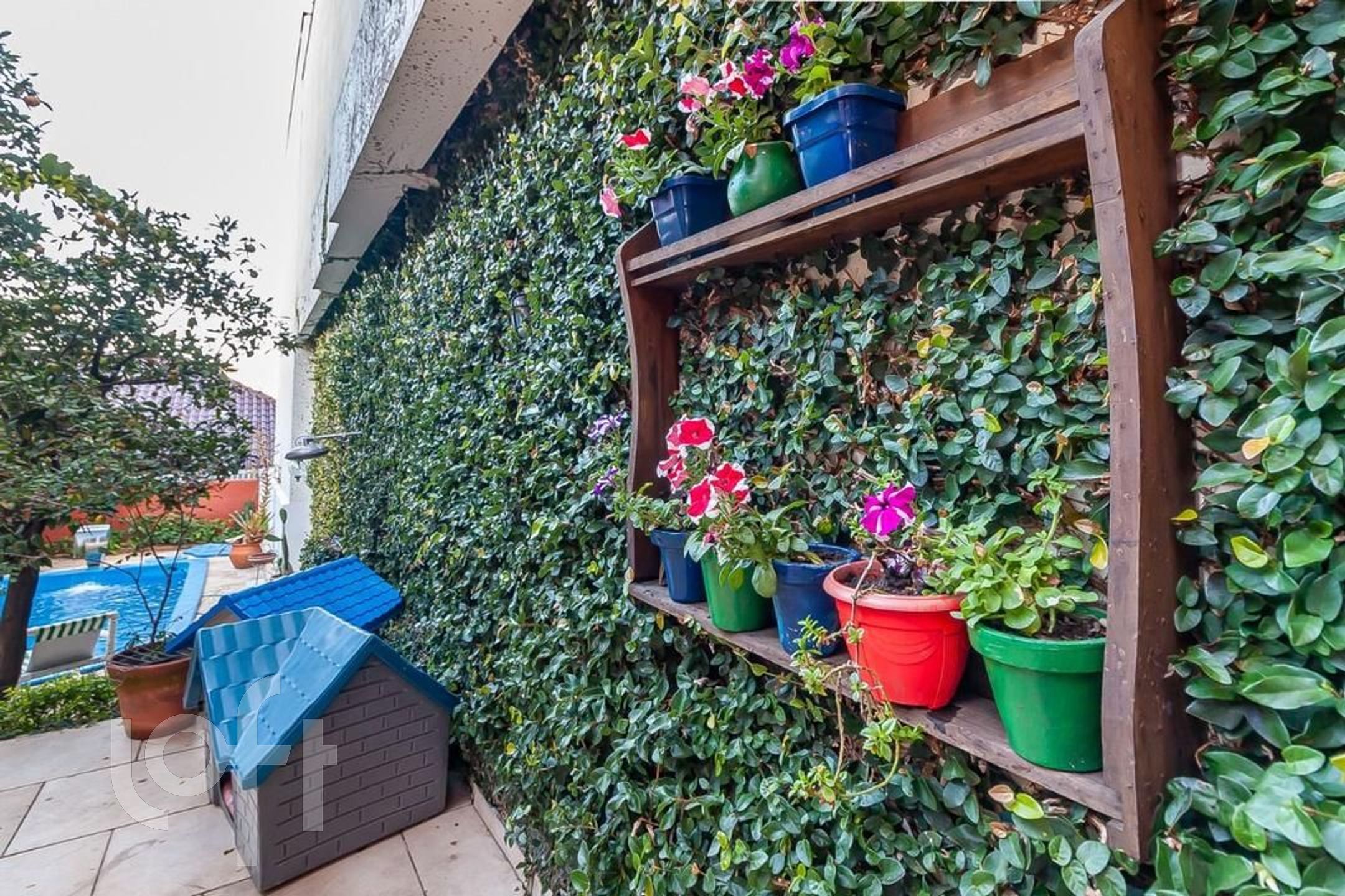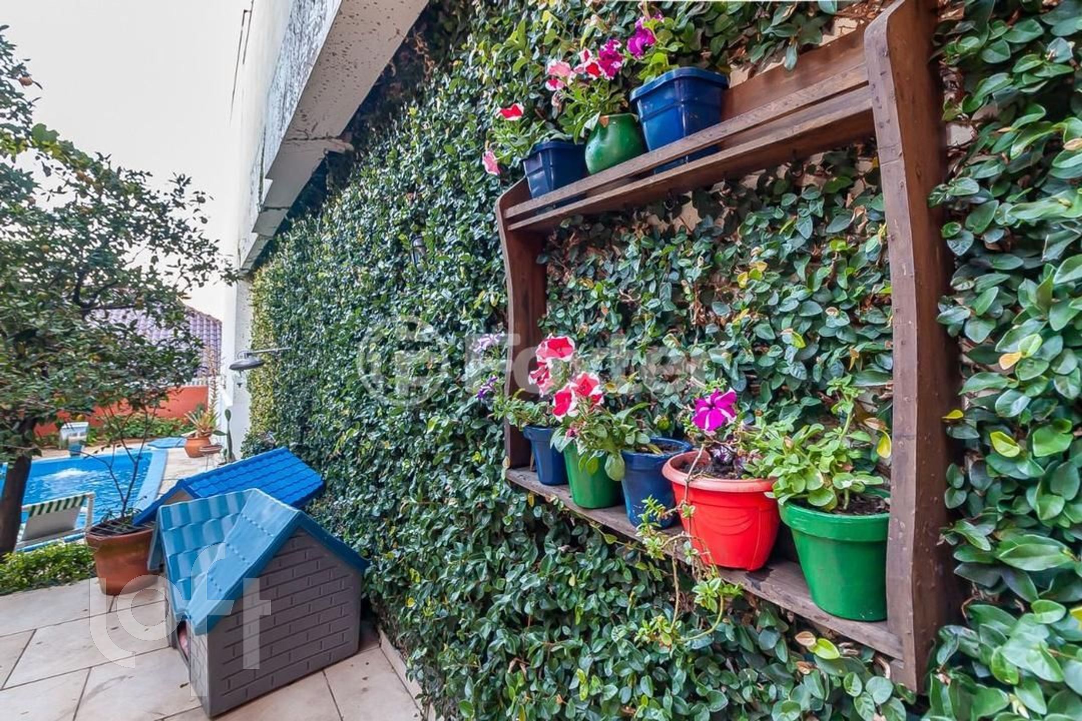 Pátio dos fundos com piscina, jardim e árvores frutíferas.