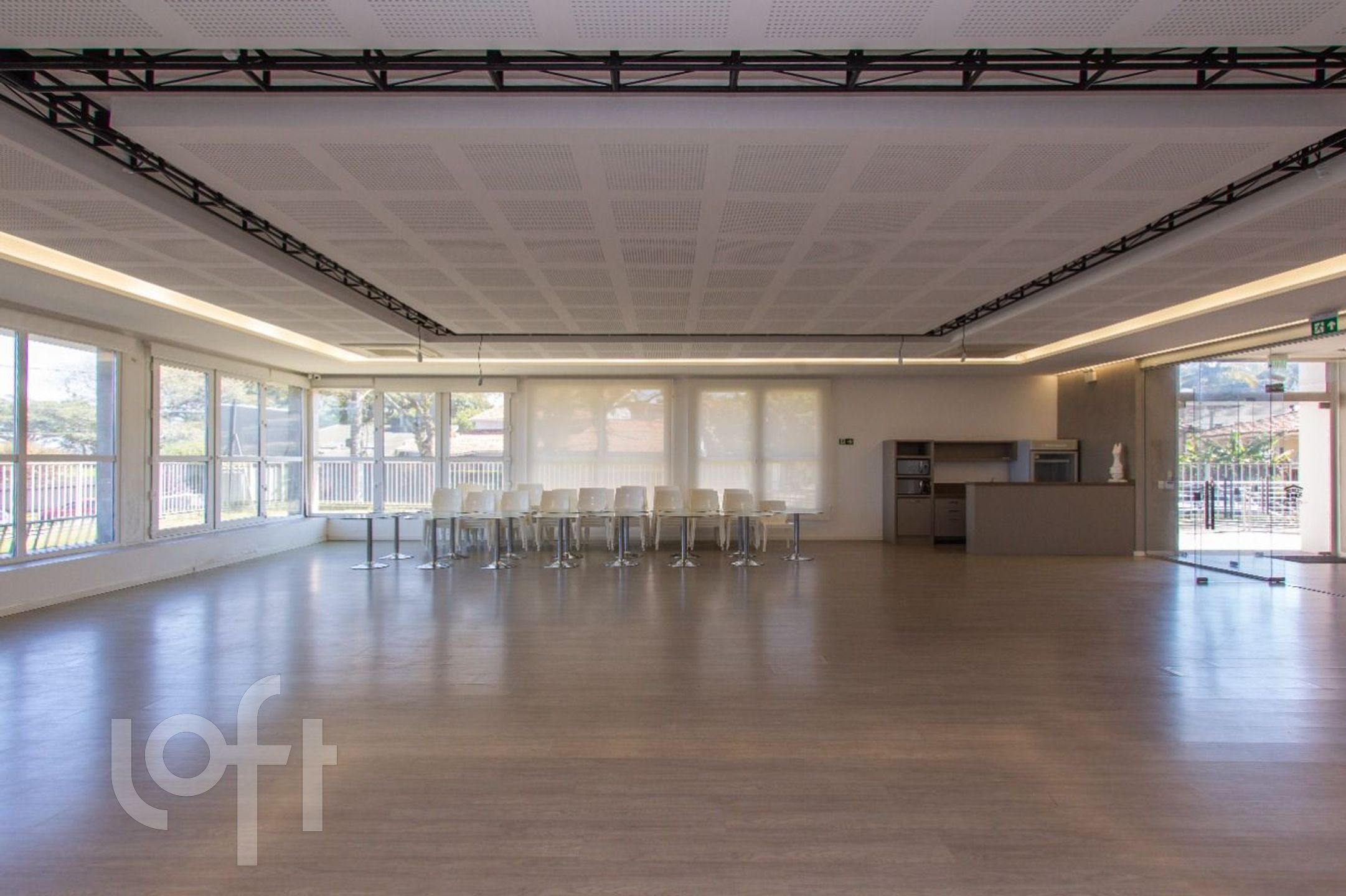No térreo, uma sala espaçosa com copa-cozinha, 3 banheiros, sendo um com acessibilidade e recepção.