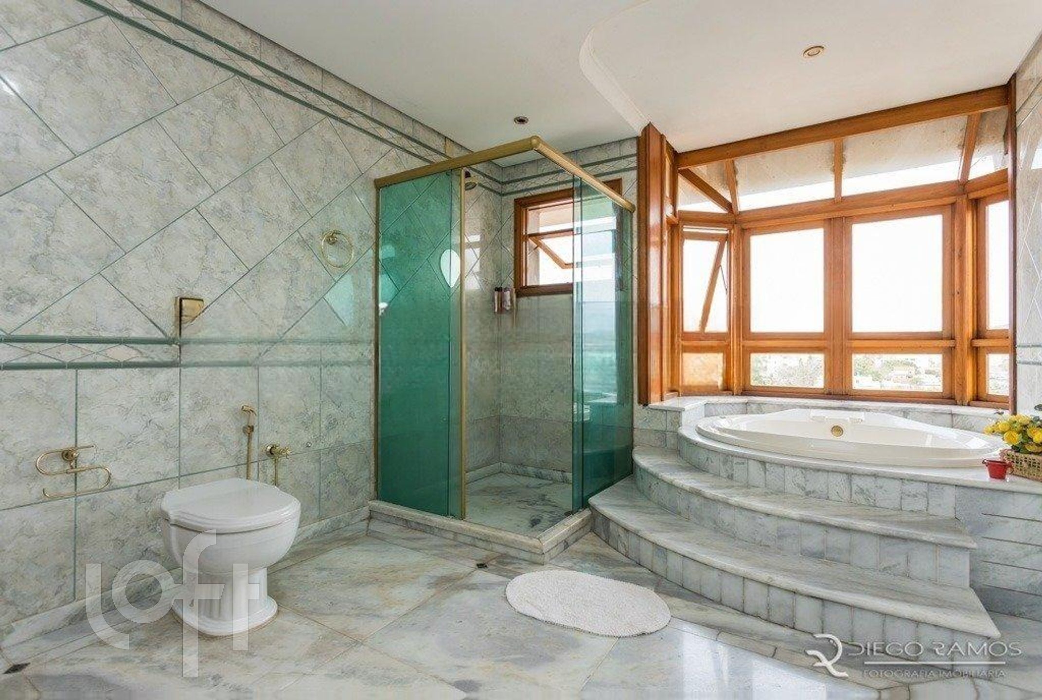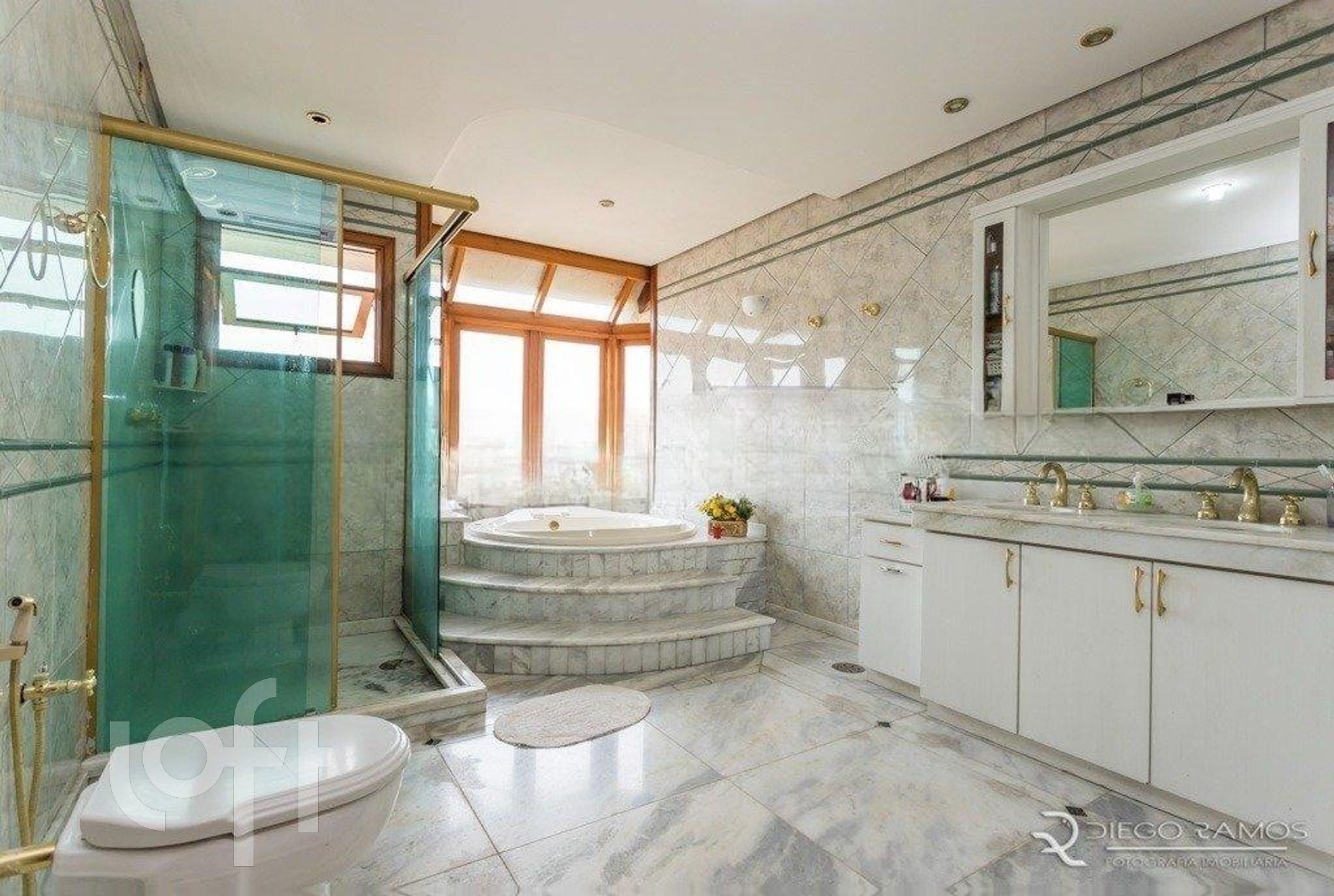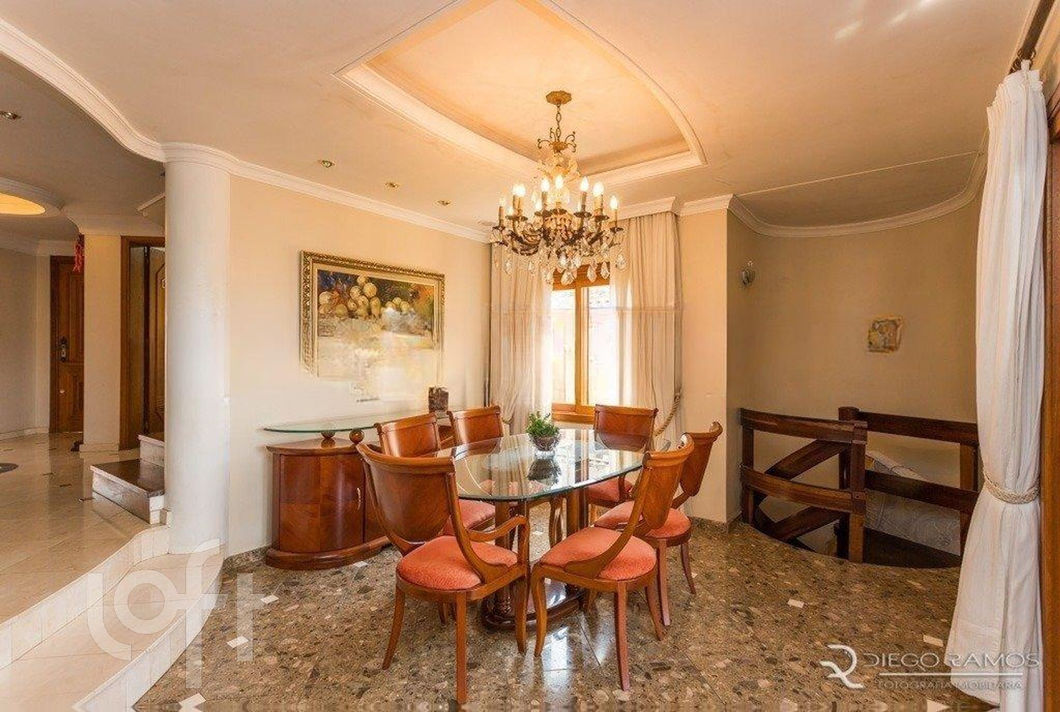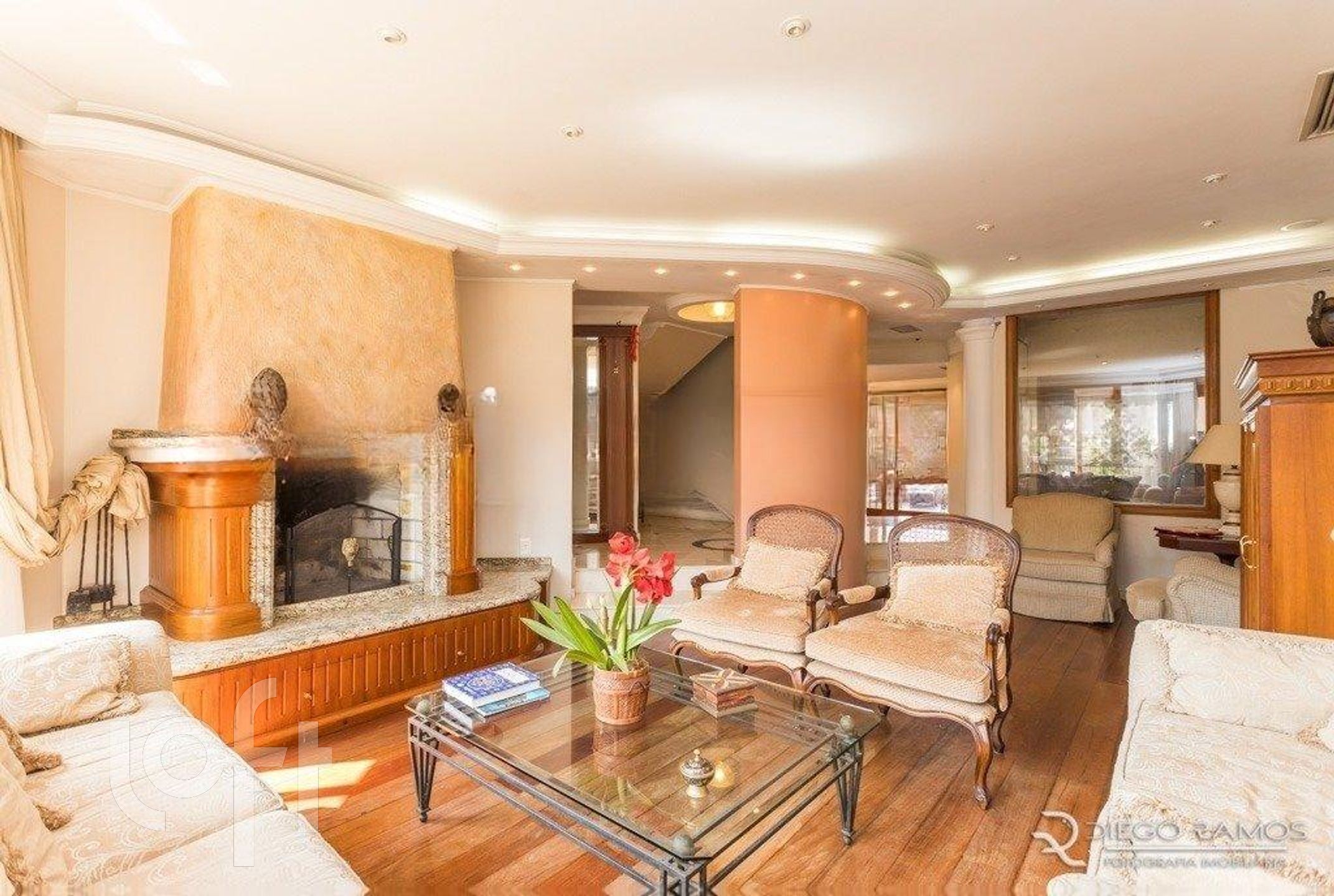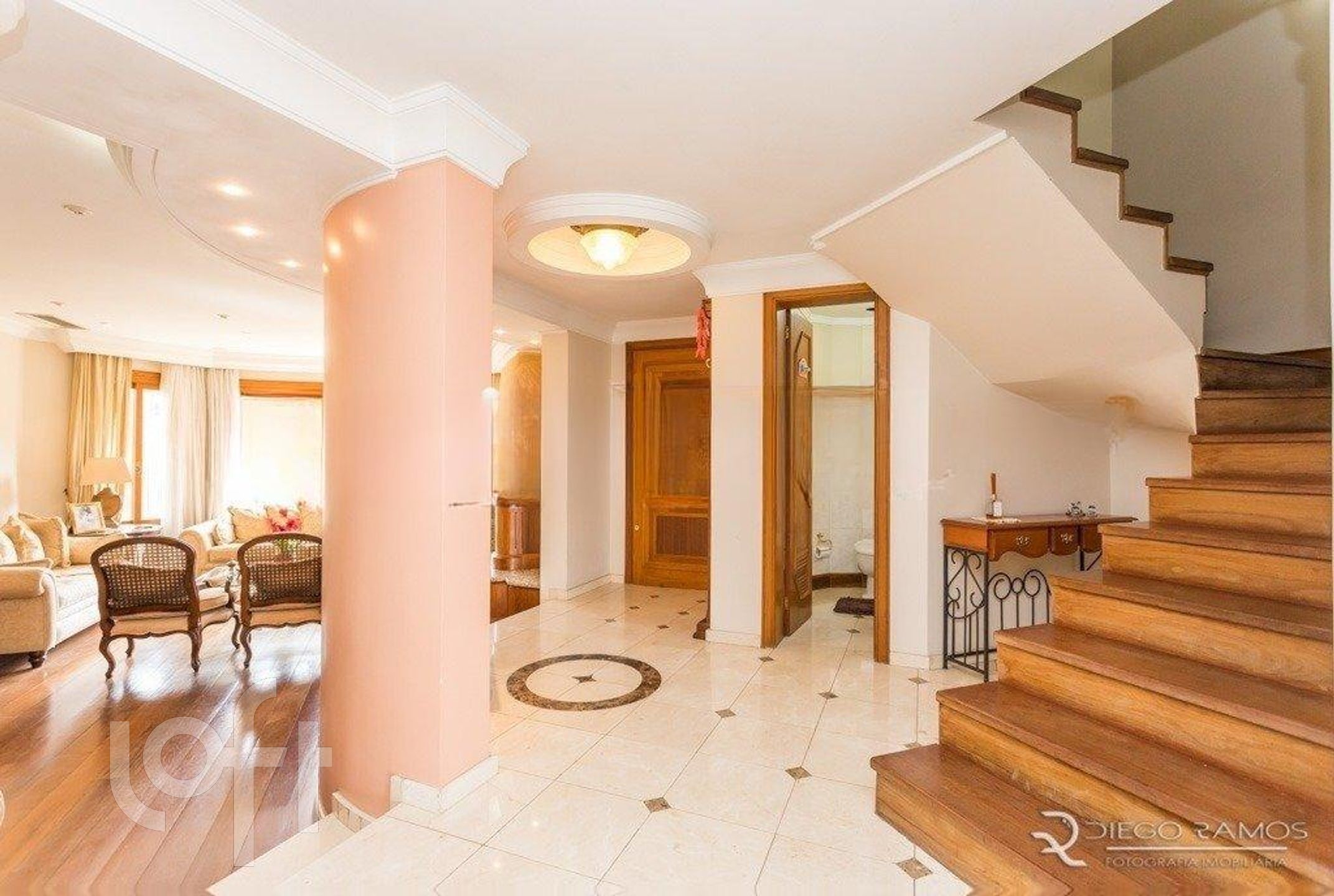 Acesso para os andares superiores, por escada imponente toda em madeira, onde se alocam 4 suítes completas, sendo uma máster com sacada aberta, closet e lindo banheiro com hidro em deck elevado e janelão com vista da cidade, mais box separado todo com piso em mármore branco.