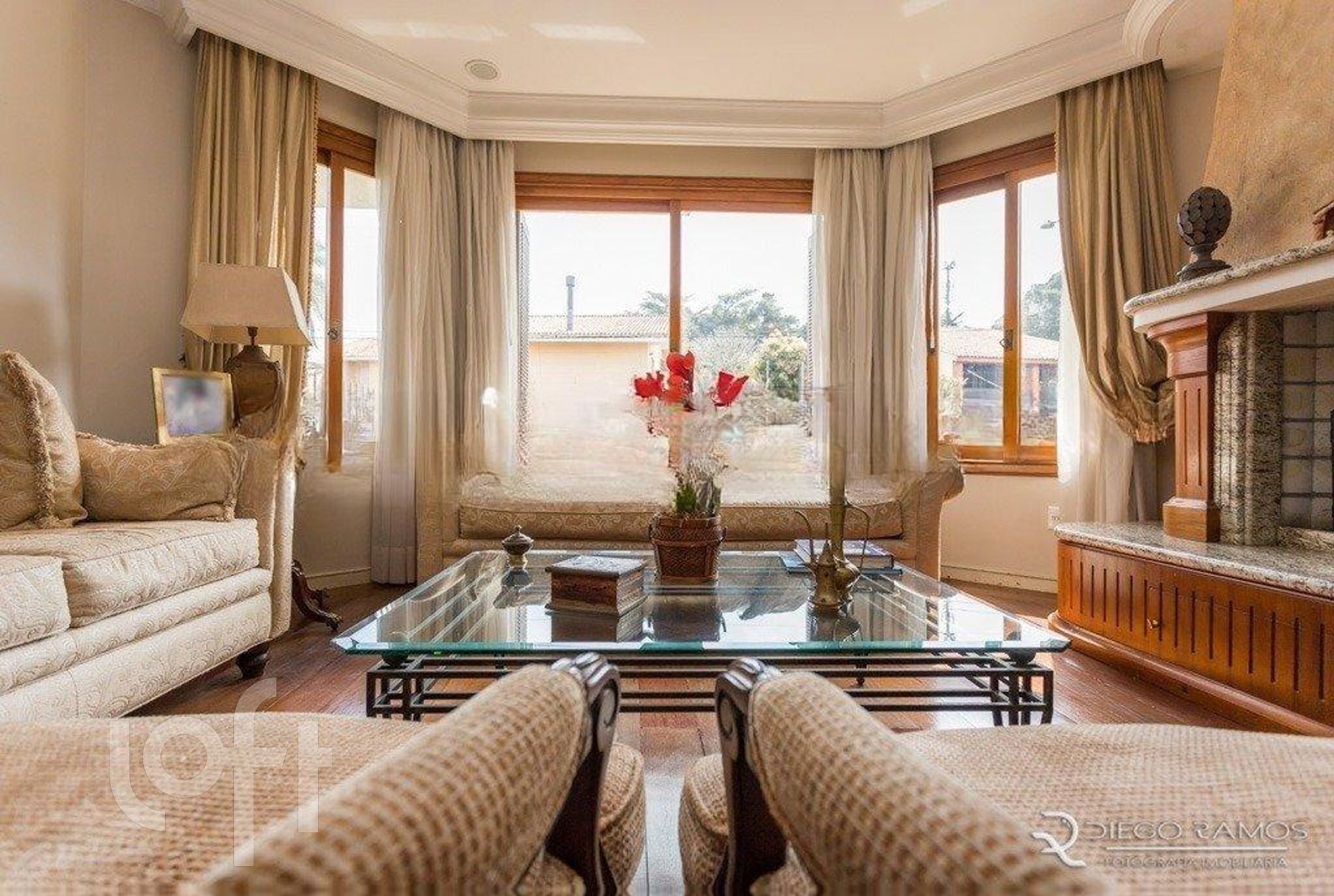 Num estilo imponente o sobrado de 3 pavimentos apresenta no térreo, em um ambiente totalmente integrando, hall de entrada com piso em granito branco, lavabo, living em desnível, todo em tabão, muito aconchegante com linda lareira, sala de jantar toda com piso em granito brow, que da acesso a