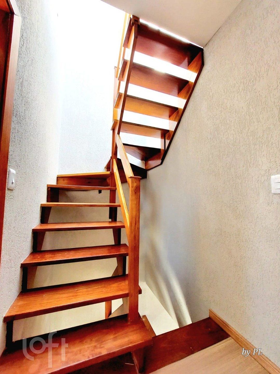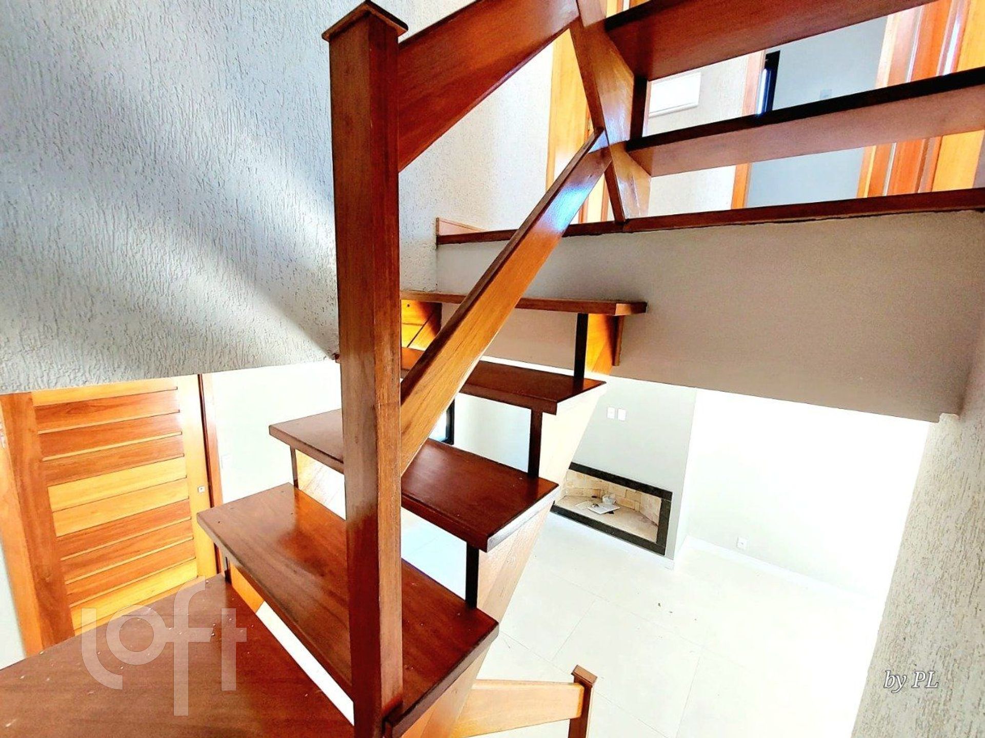 A luz natural invade o ambiente através das esquadrias em alumínio preto, complementadas por escadas em madeira nobre e guarda-corpo em vidro.